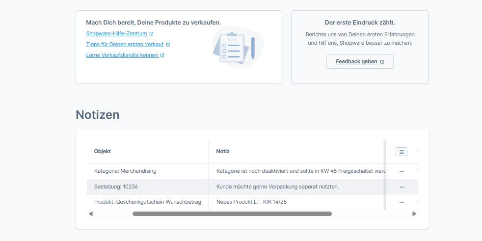 Erfasse und organisiere wichtige Informationen direkt bei Bestellungen, Kunden, Produkten und Kategorien – übersichtlich, nachvollziehbar und zentralisiert. Notizen können dabei nicht nur für eine reibungslose Zusammenarbeit im Team sorgen, sondern auch direkt in relevanten Prozessen wie dem Dashboard angezeigt werden.