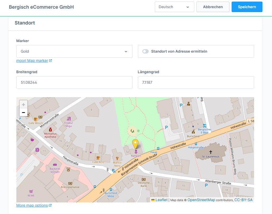 Es besteht die Möglichkeit, die Beschreibung der Standorte, sowie das Logo, Kontaktdaten und Kontaktpersonen je Standort zu hinterlegen. Ebenso können die Öffnungszeiten hinterlegt werden. So kann sich direkt von der Händlersuche aus ein Überblick über die einzelnen Standorte verschafft werden.