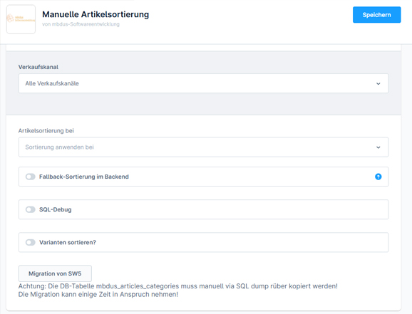 „Verkaufskanal, Fallback-Sortierung, Debug, Varianten-Sortierung sowie die Migration der manuellen Artikelsortierung aus Shopware 5 sind einstellbar.