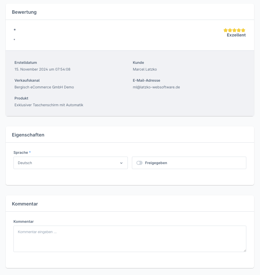 Bewertungen können automatisch freigegeben werden oder durchlaufen eine manuelle Freigabe. Ebenfalls können Bewertungen kommentiert werden vom Shopbetreiber.