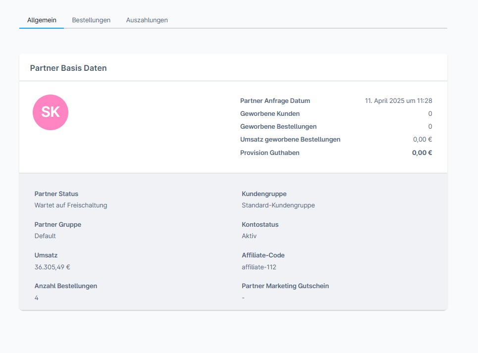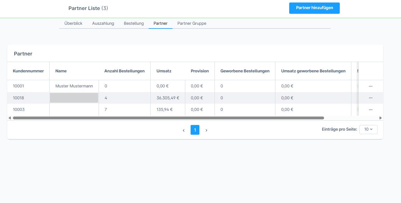 Unter dem Tab „Partner“ findest du eine vollständige Übersicht aller Affiliates. Diese Liste zeigt alle Partner, unabhängig davon, ob sie aktuell ein Provisionsguthaben haben oder nicht. Um einen Partner anzulegen, musst du im Bereich Marekting -< Affilate System einen neuen Partner anlegen und einen Affilatecode vergeben.